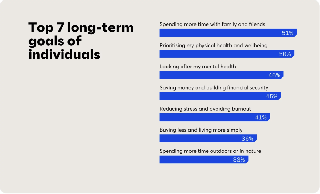 Intentional living is a purposeful shift from passive consumption to active creation. It’s a mindful rejection of “hustle culture,” where people make conscious choices about their time, energy, and resources. When it comes to the long-term goals people have there is a lift in the social, health and financial goals as well as simplicity of life and time spent outdoors.