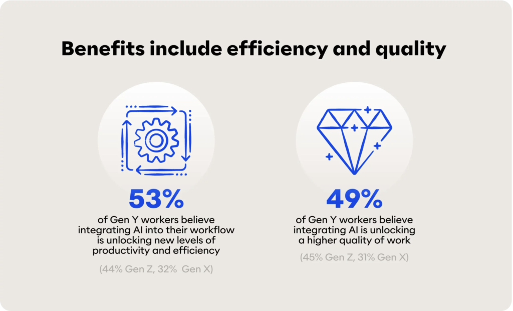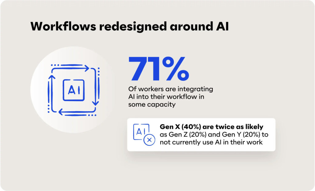 71% of workers are integrating AI into their workflow in some capacity. But not all workers are integrating AI into their workflows, Gen X are twice as likely as Gen Y and Gen Z to not currently use AI in their work. The Gen Y cohort is leading the redesign of workflows, they’re now well into their careers and have become experienced workers and managers. They’re closely followed by the digital natives Gen Z who are also redesigning workflows.