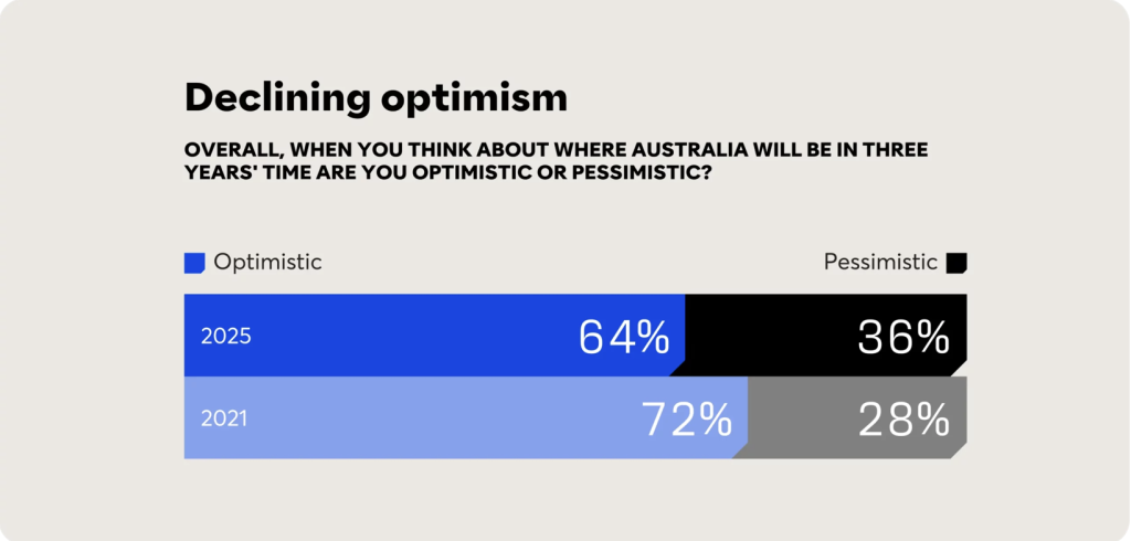 The pressures of rising cost of living, geopolitical volatility and polarisation is taking a toll on global wellbeing. The current outlook for Australia is marked by declining optimism, a reflection of the external threats and challenges many face. While 64% of Australians remain optimistic about the country’s future in three years, this has declined from 72% in 2021.